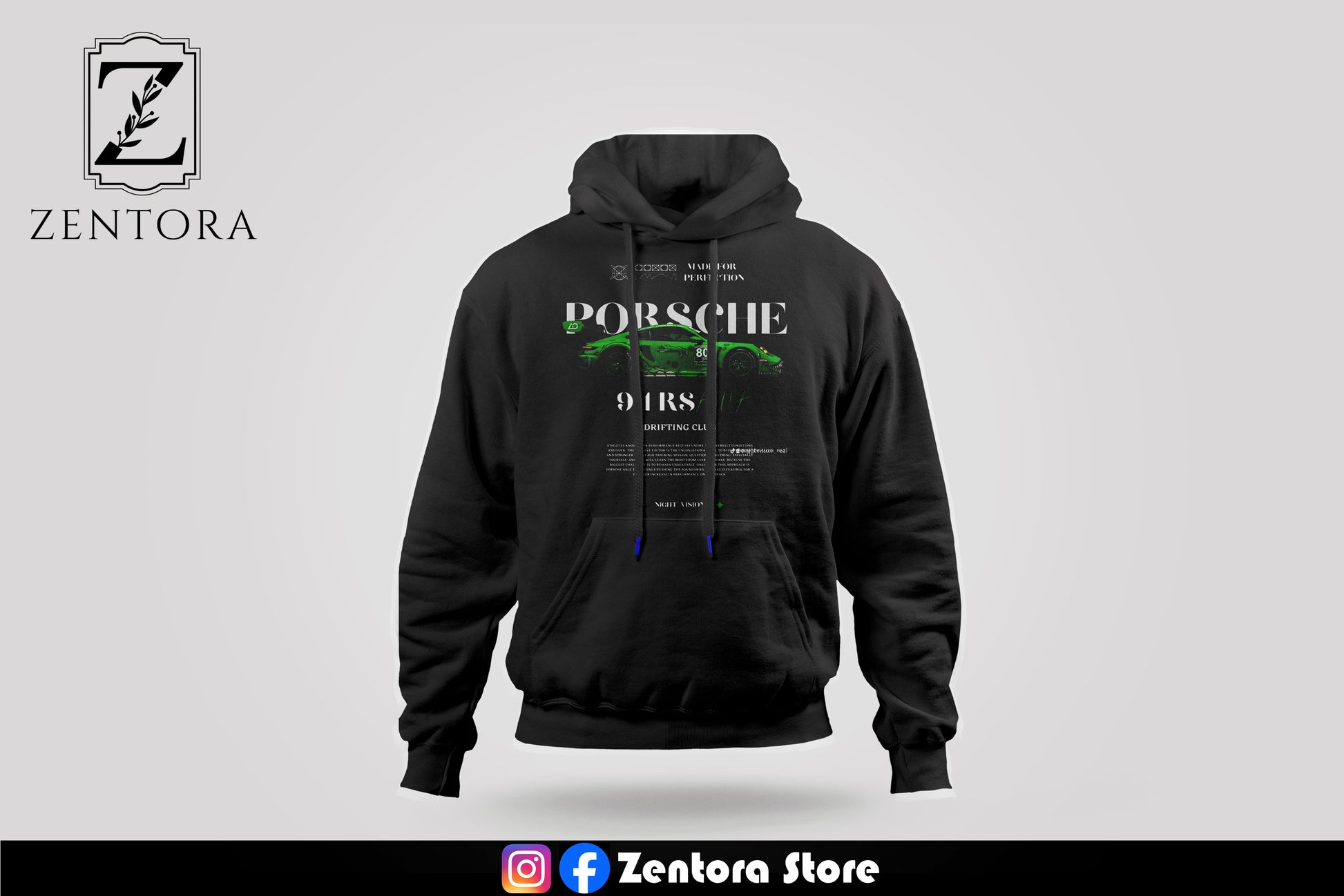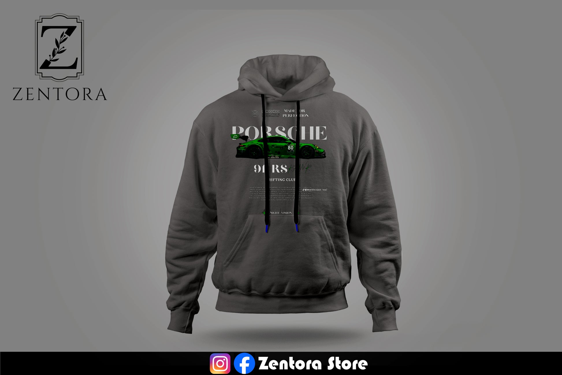 Fuel your passion for speed with this sleek dark-gray hoodie featuring a dynamic Porsche 911 RS graphic in vibrant green. Perfect for car enthusiasts who love blending style and performance. Elevate your wardrobe with this exclusive piece from Zentora Store. 🏎️💨 #ZentoraStore #CarLovers #PorscheVibes